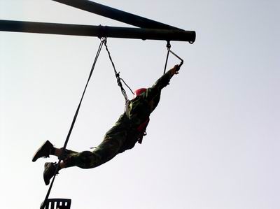 從某種意義上說,空中抓杠環節可以說是對參訓隊員勇氣、膽量和自信的挑戰,因為面對超出自己掌控能力之外的事物,最大的困難不是來自外界的壓力,而是滋生于內心深處的本能恐懼。所以,盡管整個作業過程都采取了周密的安全防范措施,但還是能感覺到大家內心的不平靜。短暫的調整之后,有人勇敢地跨出了艱難的第一步,之后的經歷證明事情似乎并沒有想象中的那么難。正如俗話所說的那樣,給自己以足夠的信心和勇氣就沒有完不成的任務,誰說不是呢?