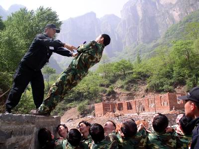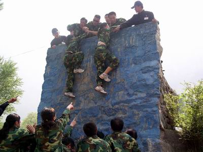什么是“不到南墻不死心”,看看橫在面前高達四米多的障礙物以及上面掩映不住的笑臉就知道了。下有隊友甘做人梯,上有同伴傾力援手,9分50秒內,28名參訓人員便順利完成了徒手攀越障礙環節的考驗。期間,不是手足卻勝似手足,沒有血緣卻又血脈相連的情與景,使得原本高不可攀的距離濃縮成了挺肩起立和下腰探手的咫尺之間……