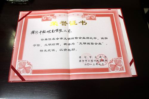 榮獲“文明誠信企業”榮譽稱號