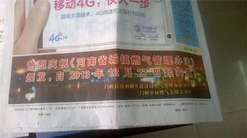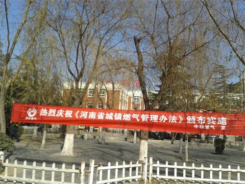 三門峽公司訊 2013年11月27日《河南省城鎮燃氣管理辦法》頒布實施,三門峽公司通過在辦公樓、加氣站、分公司、天方小區及湖濱廣場等地方懸掛橫幅,于《三門峽日報》、《黃河時報》等媒體刊登祝賀信息,于公共信息頻道滾動播出、用短信平臺發送祝賀信息等多種方式,以實際行動表達了自身對于《河南省城鎮燃氣管理辦法》之出臺的支持擁護和宣貫決心。