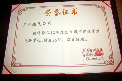 濟源公司訊 日前,濟源公司被濟源市委、市政府評為2013年度“全市城市建設管理先進單位”。