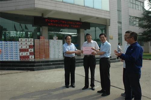 李小會董事長代表公司接受趙永貴主任(左三)發放慰問品